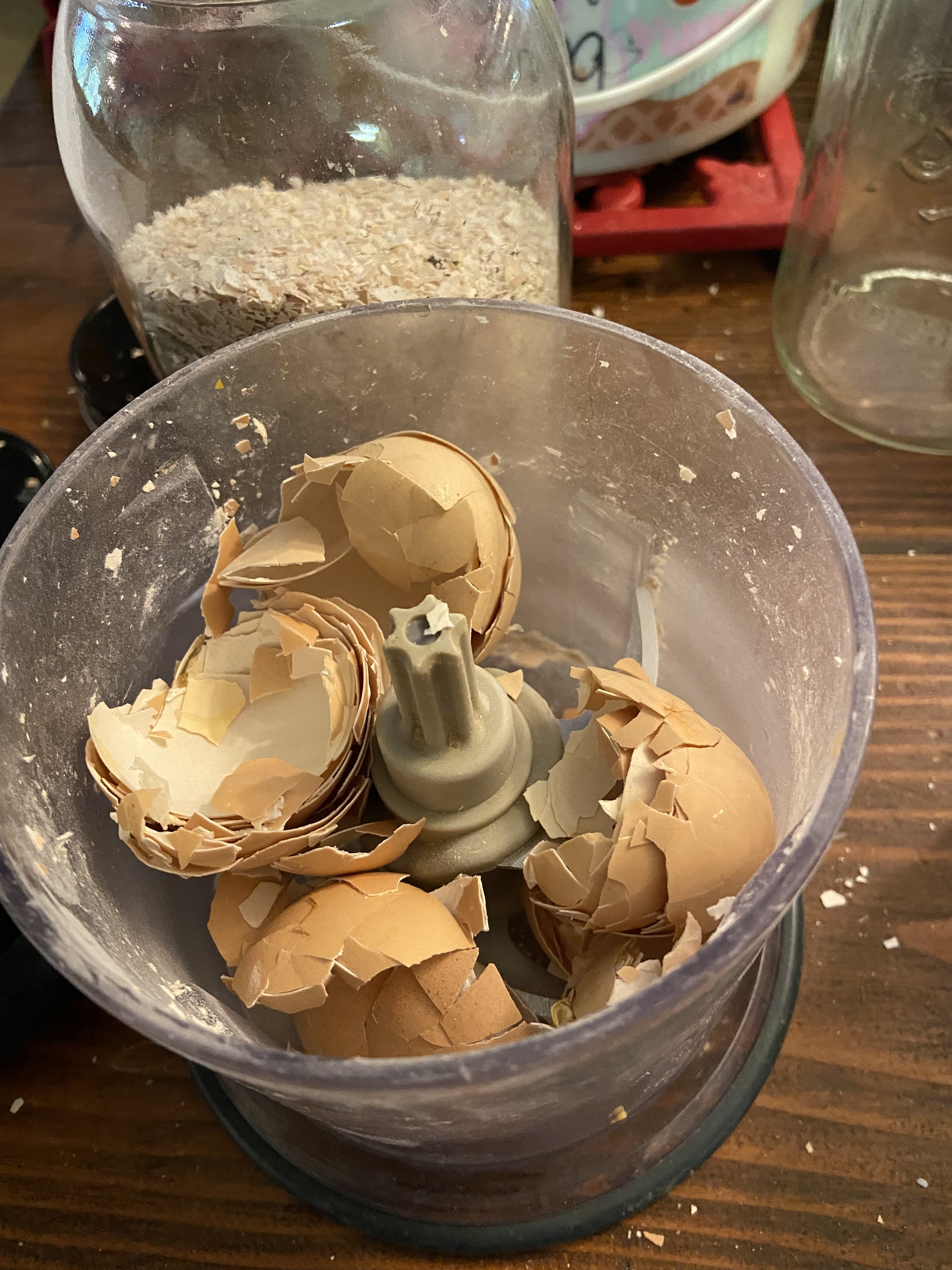 I save my eggshells. You know those favorite gallon ice cream buckets I use for everything? Well I use that for egg shells too. Every time I break an egg, I stick the shells in the bucket and put the lid on. (They can get a little stinky) When the bucket gets full, I grind the shells up with my little Ninja food chopper. You can grind them as fine as you like. I don't quite grind my into a powder, more like oatmeal size.